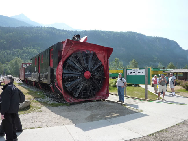 Cruise Skagway to Sitka- AlaskaThe highway into Skagway wasn't completed until 1980 so until then the railroad was used to haul freight and passengers in and out of Skagway. The front of this old train shows the method they used to clear the snow from the tracks. Previous | Album | Next |