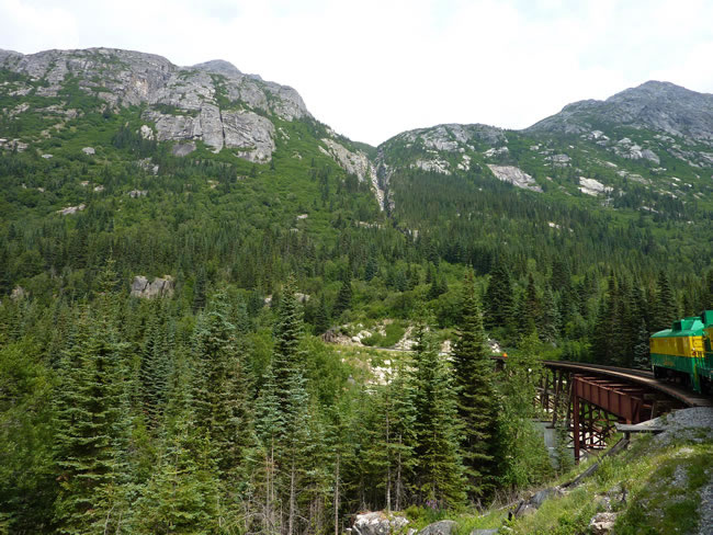 Cruise Skagway to Sitka- AlaskaThe train travelled slow enough for us to get some great photos as we approached Tongass National Forest. We crossed a number of bridges like this spanning gorges with great views in all directions. Previous | Album | Next |
