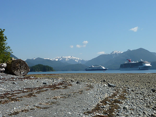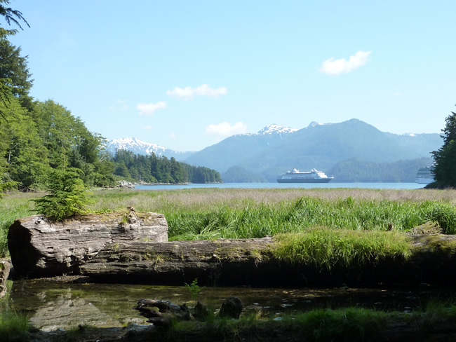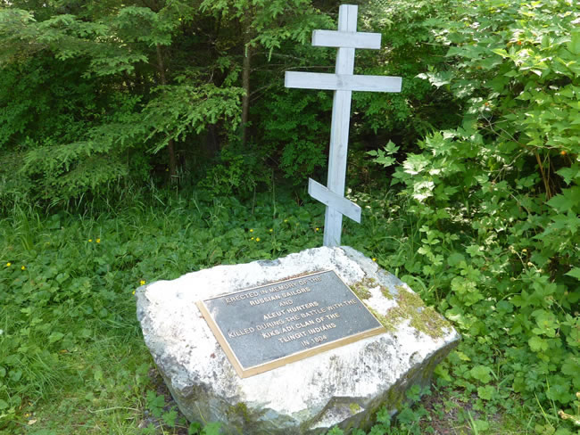 Cruise Skagway to Sitka- AlaskaThis grave was erected in memory of those killed in the battle between the Russian Sailors and the Aleut hunters of the Kiks.adi clan (Tlingit Indians). As we skirted back along the edge of Sitka Sound we again spotted our cruise ship from the walking track. You can see the big difference in sizes of the two cruise ships when they are in port. Previous | Album | Next |