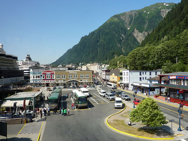 Cruise Juneau to Ketchikan - AlaskaWe travelled back on the bus and the driver pointed out Lemon Glacier, which is a hanging glacier, 8 km out of Juneau. After lunch on the ship, we wandered through town and visited Red Dog Saloon and the Harley Davidson Shop. I found a seamstress to sew the strap back on my black leather backpack/handbag that I had been carting around with me since our 2006 round Australia Trip. A bargain repair at $5.00. See our ship and another cruise boat on the left of the photo? That is how close to town we are docked! There were jewellery shops, fur shops, knife shops, diamond shops, souvenir shops and MORE jewellery shops everywhere you looked. Previous | Album | Next |
