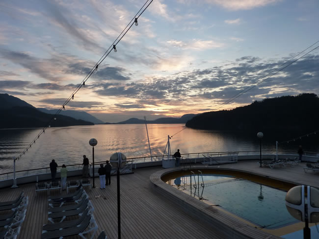 Cruise Juneau to Ketchikan - AlaskaComing down the inside passage the ocean was pretty calm which made for nice reflections from the sunset off the back of the ship. You can see how deep and narrow the passage is at many places as we windw our way south through the islands of British Columbia (we are now in Canadian waters). Previous | Album | Next |