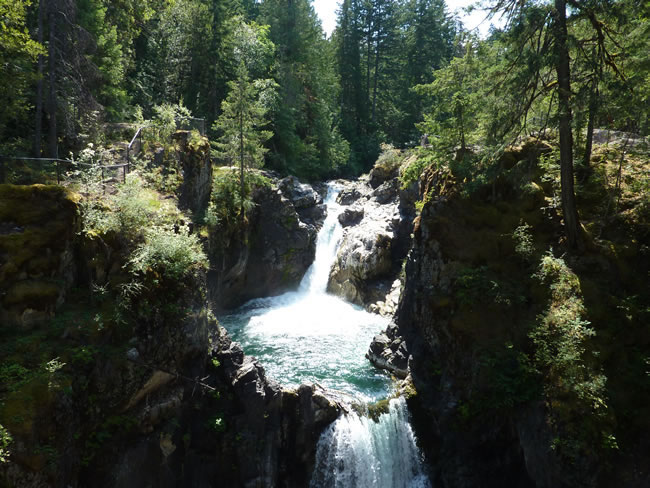 Nanaimo to Telegraph Cove - Vancouver IslandThe walking trail offered picturesque views of the river and access to both the upper and lower falls. The water was a beautiful clear blue and I imagine it was pretty cold to swim in. It didn't stop some brave swimmers - we were just happy to admire it all. Previous | Album | Next |