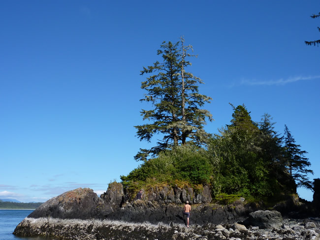 Nanaimo to Telegraph Cove - Vancouver IslandSchooner Cove Beach is accessed by a short 1 km boardwalk trail through lush rainforests with moss covered trees, ferns and a rambling stream finally taking you out onto the vast beach. As we got closer to the small island we saw an Eagle up in the tree on the left (SEE photo). Select this photo below to see the eagle up even closer. Previous | Album | Next |