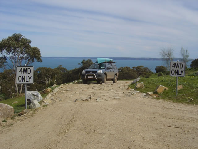 Deep Creek to Adelaide, South AustraliaThere are two main 4WD tracks in Deep Creek Conservation Park: one winds through stringybark forest and drops steeply down to Boat Harbour Beach and this one that has a VERY steep rocky descent down to Blowhole Beach. Previous | Album | Next |
