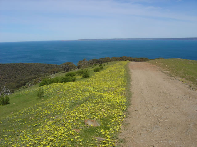 Deep Creek to Adelaide, South AustraliaThe wildflowers are just starting to come out beside the track which seems to disappear into the ocean. That is Kangaroo Island in the distance. There are stunning coastal views from the east and west sections of Deep Creek Conservation Park. Previous | Album | Next |