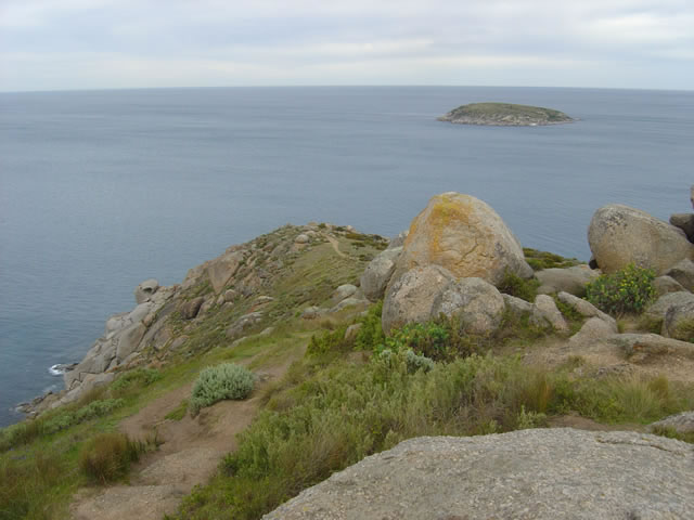 Deep Creek to Adelaide, South AustraliaIt has been overcast all day so the stunning scenery along Fleurieu Peninsula was not shown at its best. We stopped next at Encounter Bay and did the 850m Bluff Summit walk to the lookout 100m high above the ocean. There are yellow and orange coloured lichens growing on the granite boulders. Previous | Album | Next |