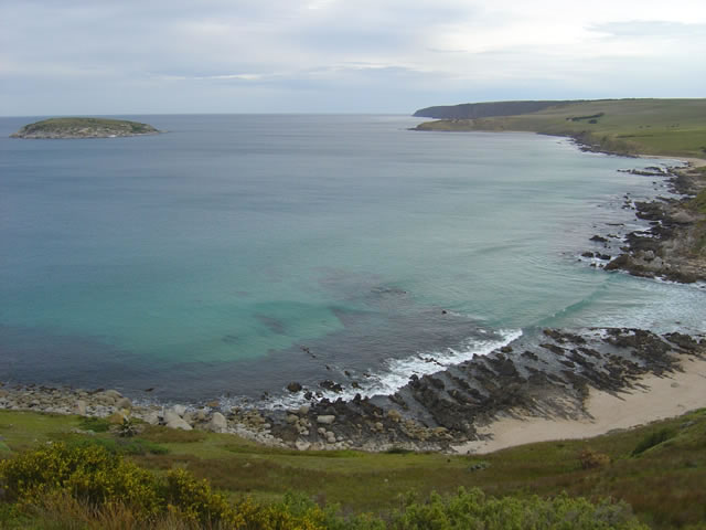 Deep Creek to Adelaide, South AustraliaThis is the view towards Petrel Cove and West Island. To the east we could see Granite Island, Wright Island and Seal Rock as we looked towards Victor Harbour. At the summit of The Bluff is a memorial plaque describing the meeting of English and French explorers here at Encounter Bay in 1802. Previous | Album | Next |