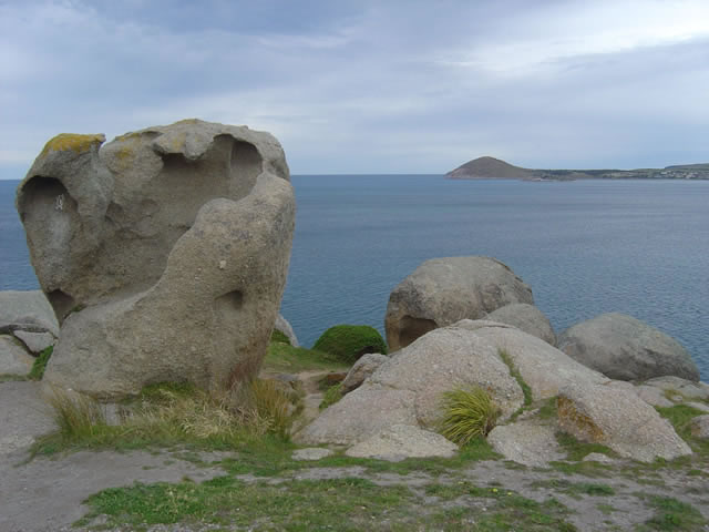 Deep Creek to Adelaide, South AustraliaThe eroded rocky granite formations on Granite Island reminded us of The Remarkables on Kangaroo Island. From this high spot on the track we could see across to The Bluff where we stood a few hours before. Previous | Album | Next |