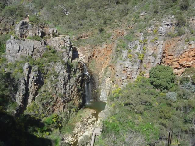 Deep Creek to Adelaide, South AustraliaAfter Victor Harbour we headed north to Adelaide. We had stayed in Adelaide on a previous trip so we decided this time to camp in the Adelaide Hills. We set up camp at the Gorge Caravan Park. The first place we visited was Morialta Conservation Park. This is a view of Morialta Gorge and Falls. Previous | Album | Next |