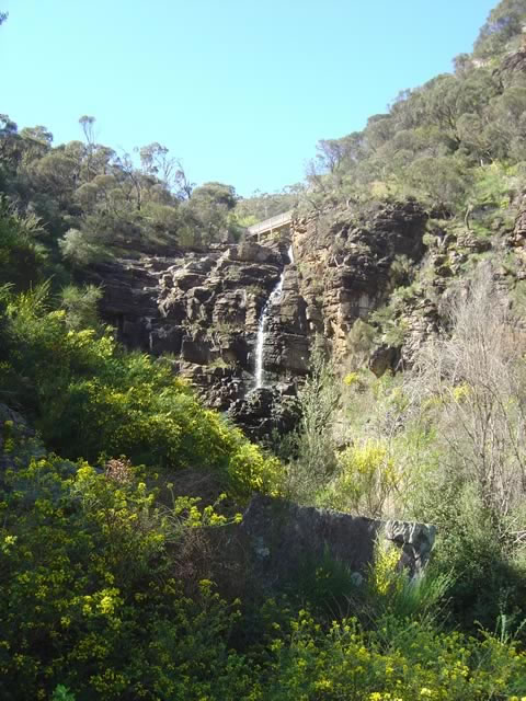 Deep Creek to Adelaide, South AustraliaMorialta Conservation Park has a number of walks with the easiest being the one past Giants Cave to the base of First Falls. You can see the bridge above the falls that we crossed to get to Deep View Lookout. Quite a few of the wildflowers were out in bloom (SEE photo). Previous | Album | Next |