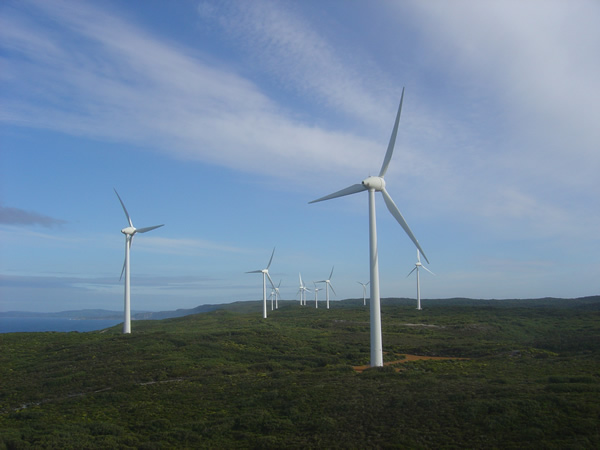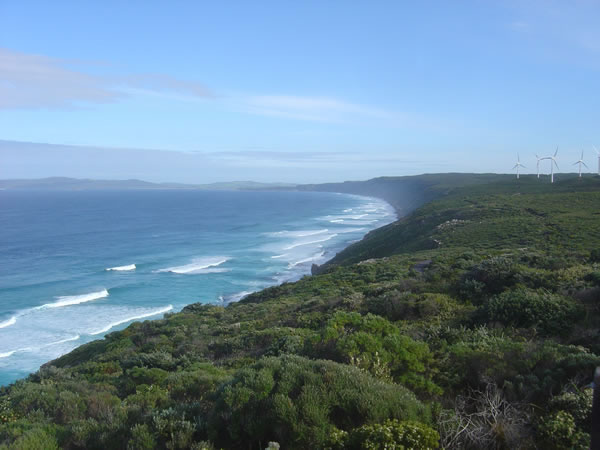 AlbanyFrom Cosy Corner Beach we could see across Torbay Bay to the Albany Wind Farm. Now we are on the other side of the bay at that Wind Farm. Each wind turbine's base has a circumference of 13.2m. At their slowest, each turbine does 10 revolutions per minute which means the blade tip is travelling at 135km/h! Have a look at the turbines up close . Previous | Album | Next |