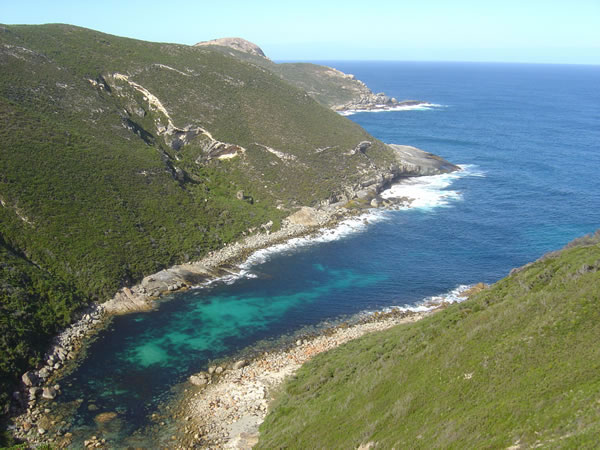 AlbanyWe continued on the scenic drive towards Albany. This pretty inlet just east of the blowholes is known as Jimmy Newhill's Harbour. Jimmy, a local fisherman, apparently sheltered here during a storm to give the inlet its name. The inlet is a 500m deep cleft in the rocks. Previous | Album | Next |