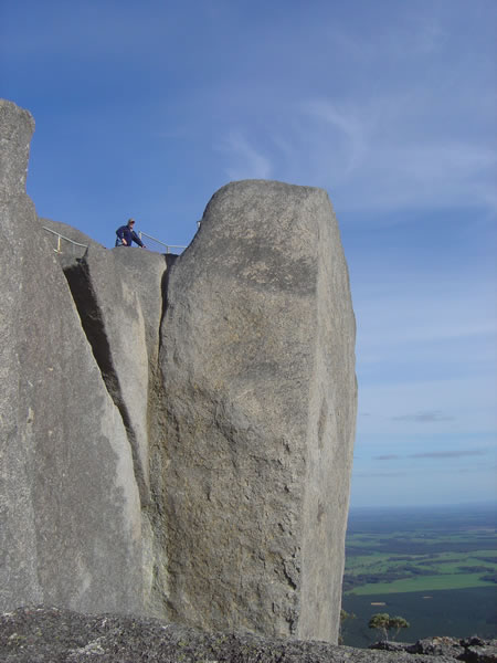 Albany to Porongurup National ParkPete makes it to the top of Castle Rock 570m above sea level. The walk has taken us up, over and around bare domes of granite and perched boulders. The massive ancient granite domes of Porongurup National Park rise up to 670 metres. Previous | Album | Next |