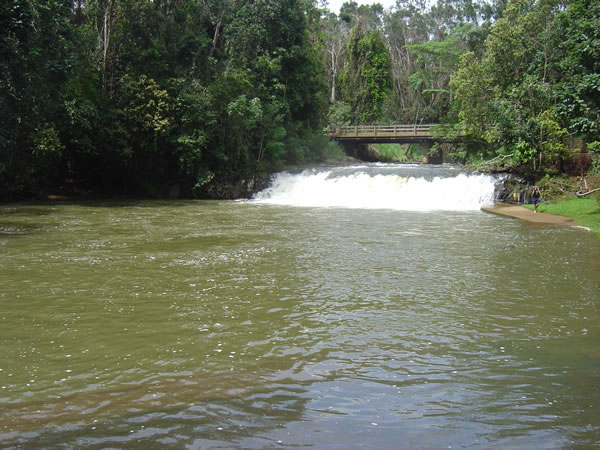 Malanda FallsNext day we tackled more waterfalls starting with this one in Malanda. The cheese factory was closed due to it being Anzac Day public holiday so we couldn't do that tour. Need to leave something for next time I guess. Malanda Falls has been dammed up enough to make this a public swimming pool. At the moment it was flooding the sides of the park and the steps and rails were submerged. The floods from Cyclone Larry were retreating as debris in the trees surrounding here indicated. Previous | Album | Next |