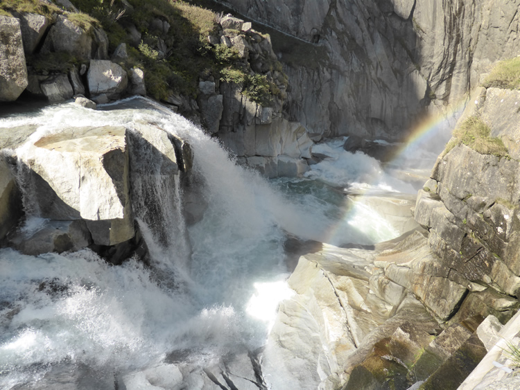 UK and Europe Roadtrip - Over Alp/Oberalp PassThe Swiss Alps are the source for the Rhine River which we see here at the Oberalp (Over Alp) Pass. The waterfall goes under the road but we can also take a walkway across to the other side. Such spectacular views! Select the photo below to see more. Previous | Album | Next |
