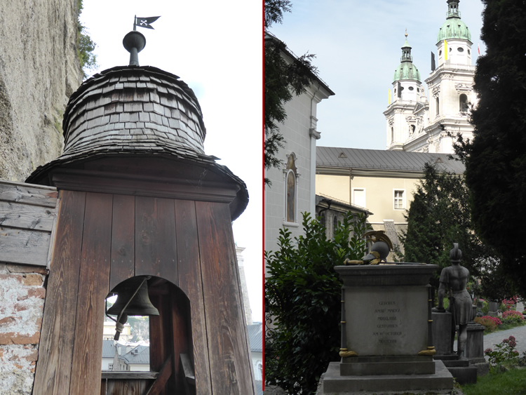 UK and Europe Roadtrip - Salzburg Old TownThe old wooden bell tower (left) has been rebuilt beside the catacombs. From St Peters Abbey grounds you are not far from the Salzburg Cathedral (right) which was built in the 1600s. Select the photo below to see St Margarets Chapel. Previous | Album | Next |