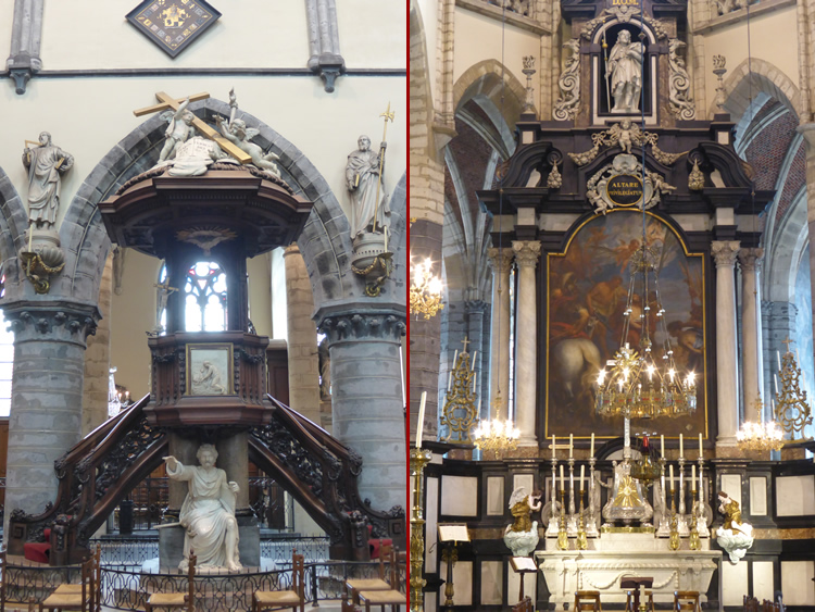 UK and Europe Roadtrip - GhentSt Jacobs Church has a wooden pulpit (left) that was built in the late 1700s. The statue at its base is of St James (Jacob) depicted teaching the bible to the people. The main altar (right) has a painting called The Martyrdom of St James the Major by Jan Bockhorst which was done in the mid 1600s. Previous | Album | Next |