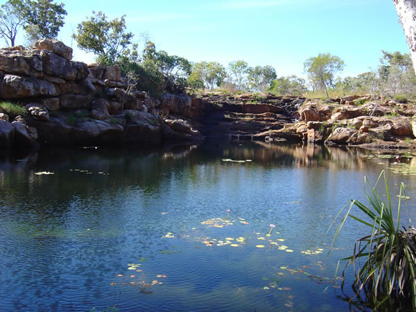 Bell and Lennard River Gorges, Gibb River RoadWe visited a series of waterholes separated by small waterfalls and rapids called Donkey Holes. Very picturesque - we had a swim in the clear cool water. We were disappointed we couldn't get to the gorge best suited for canoeing - have to leave that for next time. Previous | Album | Next |