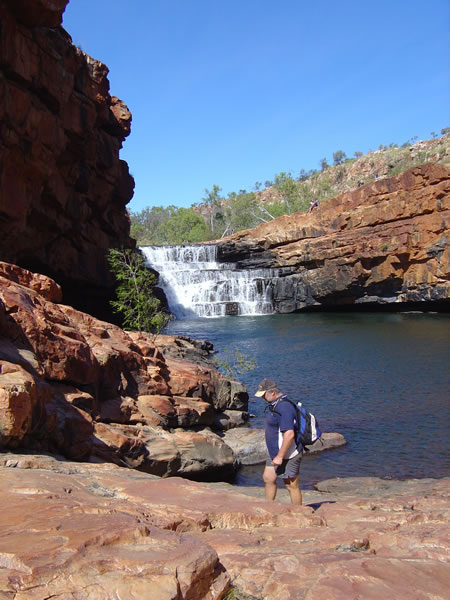Bell and Lennard River Gorges, Gibb River RoadThe walk crossed the top of Bell Falls so it was wet feet and shoes on and off again. Pete dropped his sunglasses in the creek never to be seen again. Maybe that is what he is looking for here at the bottom of those falls. The walking track was marked by small rock cairns that were not always easy to find. We climbed up the cliff to the left of this photo then clambered down again to the pool below. Previous | Album | Next |