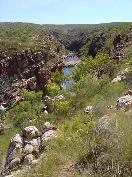 Bell and Lennard River Gorges, Gibb River RoadWe managed to lose sight of the small rock cairns and so got off the track on the way back. You can't really get lost with a gorge right next to you BUT the spinafex is bad if you get off track. We got a nice photo from the top of the gorge where we climbed so we could spot the track again but we also got a lot of scratches on our legs for our troubles. Previous | Album | Next |