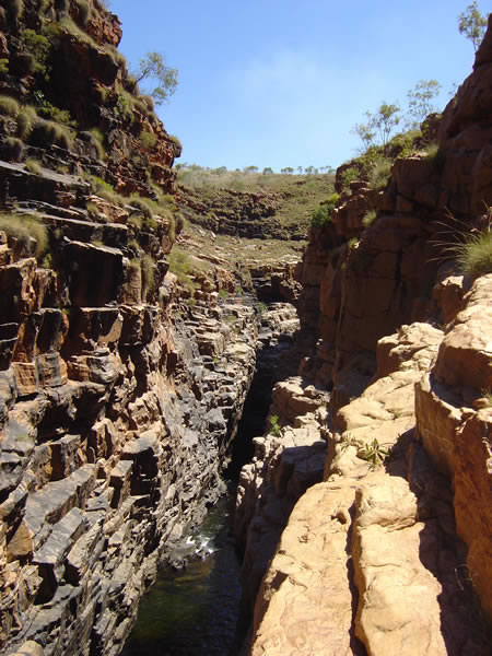 Bell and Lennard River Gorges, Gibb River RoadThe Lennard River slices its way through the King Leopold Range forming Lennard Gorge. The walk takes you along the top edge of the gorge. We are following little rock cairns again as it is hard to see the track. It is quite a narrow but deep gorge at this section. Previous | Album | Next |