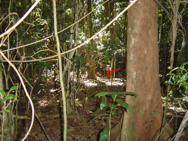 Binna Burra, Lamington National Park, QueenslandWe saw a number of pademelons just off the side of the walking track near the start of the walk. They like to graze on the edge of the camping and picnic areas. See the red arrow. Previous | Album | Next |