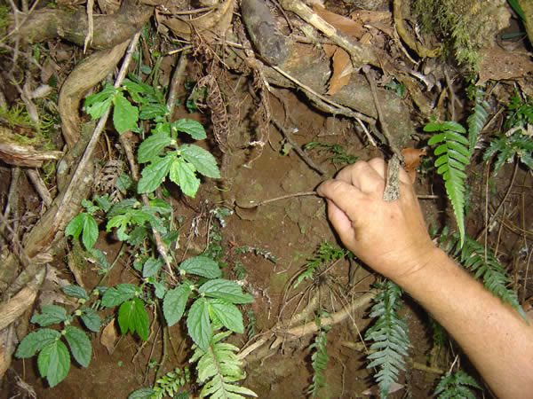 Binna Burra, Lamington National Park, QueenslandWe are usually on the lookout for Trapdoor Spiders who like to tunnel their homes into the soft soil of vertical banks beside walking tracks. They are well camoflaged but if you look carefully you can see the round 'doors' to the tunnels. Pete is carefully lifting one up. Previous | Album | Next |