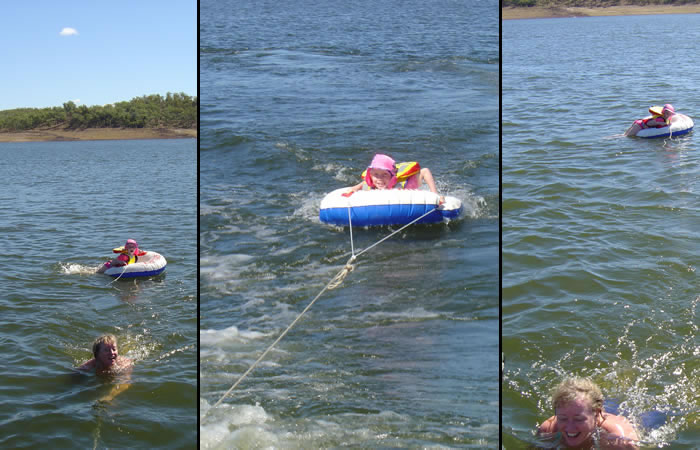 Boondooma Dam, Lake and Campgrounds, QueenslandThere is plenty of room for all types of watersports on Boondooma Dam. Cathy fell in but Emily was a bit of an expert on the tube. If you're planning on doing some fishing, don't forget to organise a fishing permit. A stocked impoundment permit is needed to fish. Previous | Album | Next |