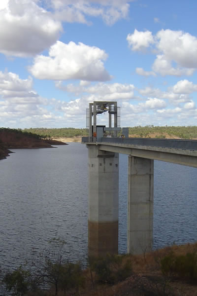 Boondooma Dam, Lake and Campgrounds, QueenslandWe took the walk out across the dam wall and onto the water intake tower. You can see from the brown discolouration the level that the water used to sit at. This water is pumped to Tarong Power Station (97km away). It is also released downstream to provide a regulated supply for irrigation along the Boyne River. Previous | Album | Next |