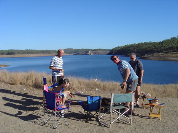 Boondooma Dam, Lake and Campgrounds, QueenslandYou can't beat cooking on an open fire with a view like this!!! The rule is you must have bacon and eggs for breakfast of course when you are camping. The guys all have to stand around and poke and prod to make sure it is cooking just right. Previous | Album | Next |