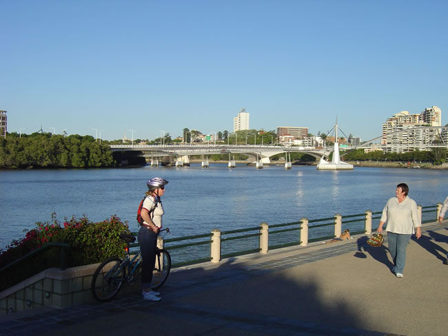 Brisbane Day TripsThe Goodwill Bridge in the background is open to bikes and pedestrians only. It runs from Southbank across to QUT campus near the Botanical Gardens in the City. This makes for an easy bike ride through Brisbane city. Previous | Album | Next |