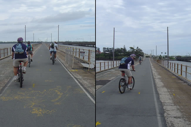 Hornibrook Bike Ride - RedcliffeThis is us riding on the old bikeway which was the Hornibrook bridge. Most of this old Hornibrook bridge has now been removed and the sections left are popular for fishing. The new bridge includes pedestrian and cycling paths as well as fishing platforms. It duplicates the existing Houghton Highway bridge. Previous | Album | Next |