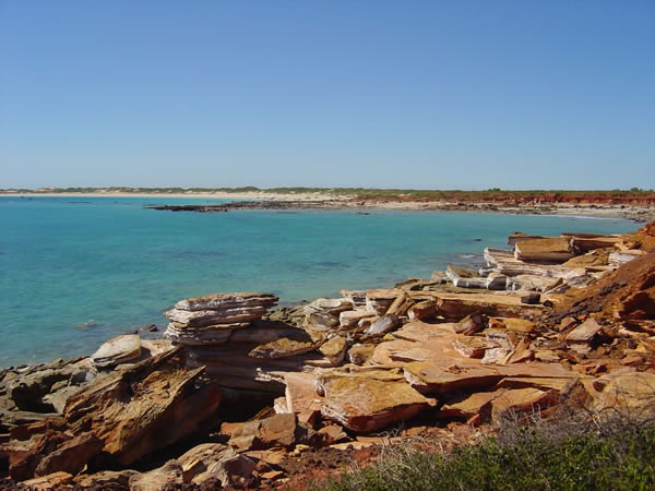 Broome, Western AustraliaFrom the point looking back towards Cable Beach you can see the 4WDs and boat trailers on the beach where the boats are launched. They are those specks on the beach just passed the dark rocks! That is where we had paddled from. Previous | Album | Next |