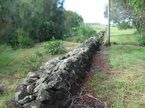 Bundaberg - Mon Repos BeachThese stone walls were built by the Kanakas out of local volcanic rock in the 1880s. Kanakas were Melanesians from the South Pacific Islands who were indentured to work in Queensland canefields. Part of their work was to clear volcanic rocks to allow cultivation of fields. The rocks were packed together to form fences and these could be seen all over the district. Previous | Album | Next |