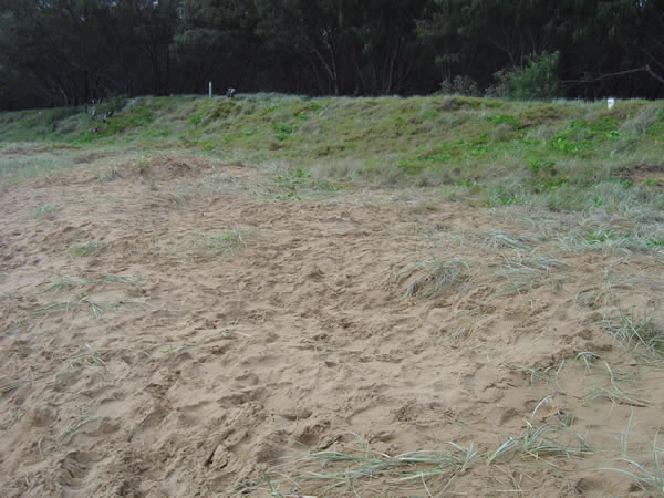 Bundaberg - Mon Repos Turtle Rookery - QueenslandThe female loggerhead turtles make their way from the surf to above the high water mark to dig a shallow hole and lay their eggs. The park rangers put markers above the areas where they lay the eggs. The eggs from these two sites have been relocated after the female sea turtle returned to the ocean. This is to ensure the majority of the eggs hatch and are returned to the sea safely. This is particularly important in cases where the turtles lay their eggs in the patrolled beach area. Previous | Album | Next |