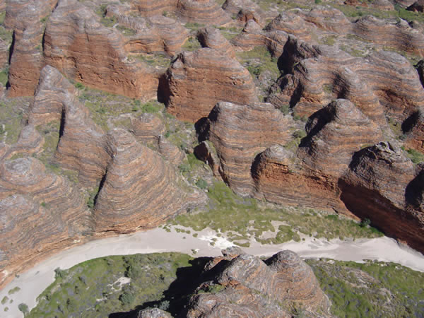 Purnululu National Park (Bungle Bungles)Weathering of the sandstone over many years formed the domes, gorges and chasms. The formations would have eroded away competely if it wasn't for the protective coating of silica (orange), black and blue green algae which form the stripes of colour you see. Previous | Album | Next |