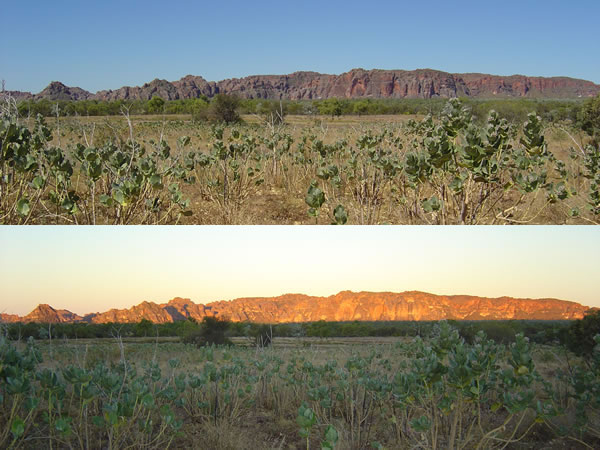 Purnululu National Park - Bungle BunglesNear the campsite is a lookout for viewing sunsets along the Western Wall - it is striking the ways the colours change on the rocks. In the previous album you saw how the rocks seemed to just rise up from the surrounding landscape. This is what we see here in the distance. Previous | Album | Next |
