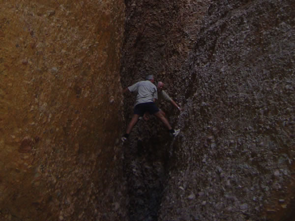 Purnululu National Park - Bungle BunglesThe Echidna gorge ended and of course Gary and Pete had to climb up the walls at its narrowest point. Funny that Karen & Cathy didn't feel the same compulsion! It is a spectacular 200m long chasm. Previous | Album | Next |