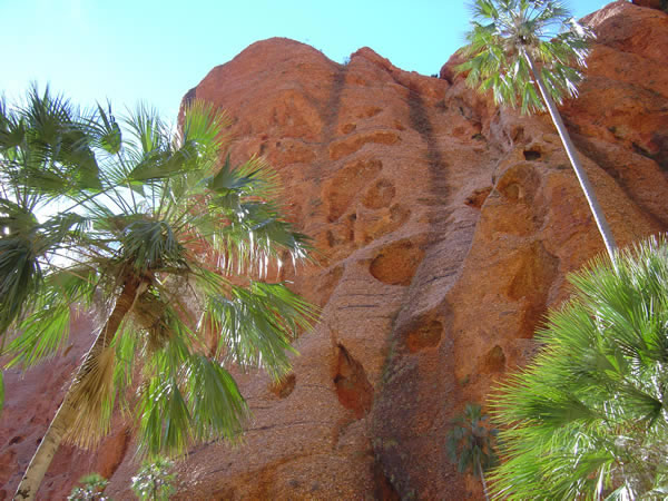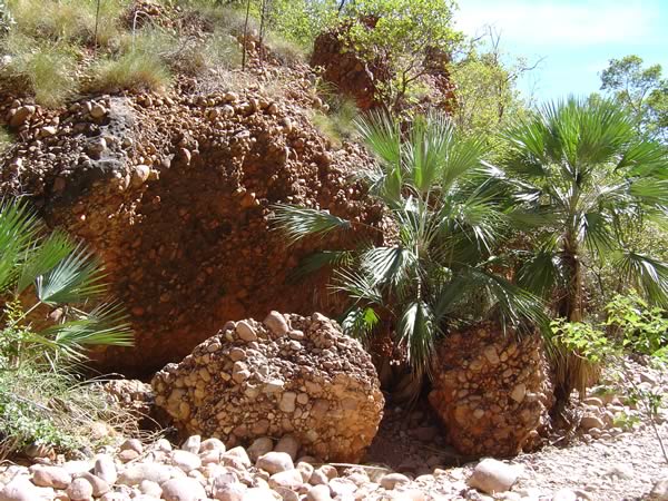 Purnululu National Park - Bungle BunglesBack out in the light again the sun had moved across and the colours on the rocks had changed again. The large holes in the rock wall were where great chunks had fallen down. These chunks of conglomerate were scattered along the walk. Previous | Album | Next |