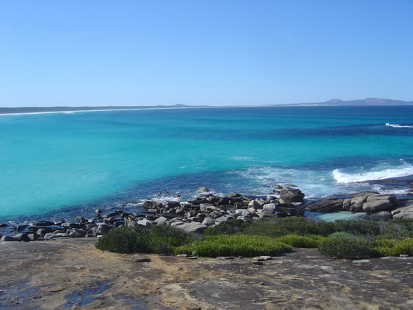Cape Arid National Park, WAFrom a similar vantage point, now looking across Yokinup Bay you can see how large the bay is and the amazing colour of the water here. There are some whales lazing about in the bay but they are hard to see in this photo. Previous | Album | Next |