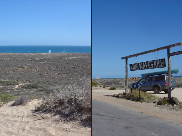 Carnarvon Blowholes to Red BluffFrom a distance the flat coastal plain appears to drop off into the ocean which appears relatively calm except for the occasional plume of water shooting vertically into the air. The sign 'King Waves Kill' seems a little dramatic BUT as you get closer you realise how dangerous this coastline is. Previous | Album | Next |