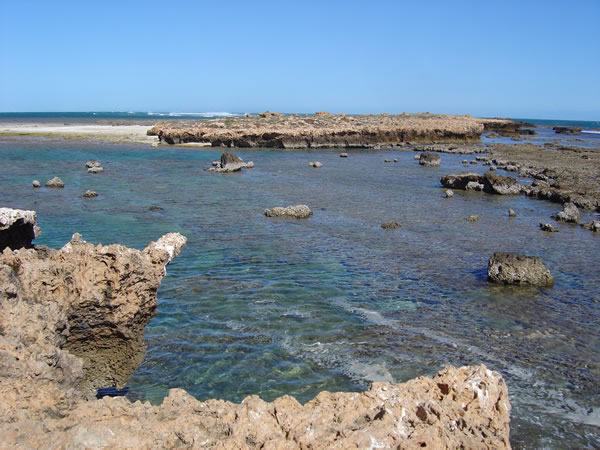 Carnarvon Blowholes to Red BluffThis is Point Quobba. The waves crash on the outside of this but inside is coral and a marine sanctuary. You can't fish in this lagoon but you can snorkel or just go reef walking. It is pretty shallow (and cold and windy) so we didn't try snorkelling but we were told it was very good. Previous | Album | Next |