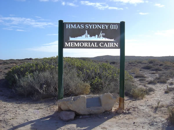 Carnarvon Blowholes to Red BluffNext day we drove north along the coast stopping first at the HMAS Sydney Memorial Cairn which is on top of the cliffs near Quobba Homestead. All 600 Australians lost their lives in the battle with the German Destroyer 'Cormoran' somewhere between Carnarvon and Geraldton. A life boat from the 'Cormoran' washed ashore just north of here at Red Bluff with some German survivors from the battle. Previous | Album | Next |