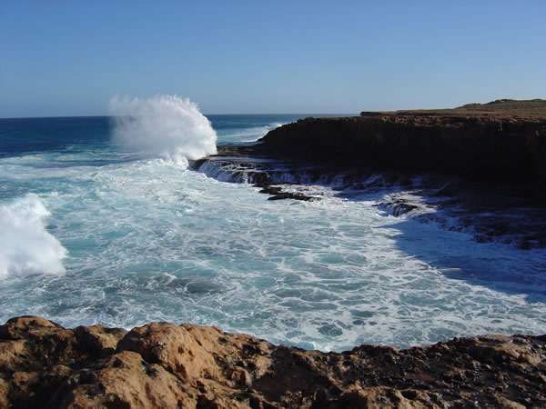Carnarvon Blowholes to Red BluffThe coastline is awesome with waves pounding into and over the rocks. The scenic drive takes you to a number of lookouts and fishing spots. How you keep a line in the water here I don't know! There are a number of memorials to lost fishermen along this stretch of coast. Previous | Album | Next |