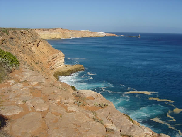 Carnarvon Blowholes to Red BluffFurther north at Cape Cuvier the gypsum and salt from nearby mines are loaded onto ships. They used to push it straight off the cliffs onto the ships below but now they have built a wharf which you can see in the distance. From this lookout above the cliffs you can also see the ship wreck of the Korean Star. The cliffs are about 90m straight up yet we saw someone fishing on the rocks below. He must be a mountain goat to be able to get down there!!!! Previous | Album | Next |