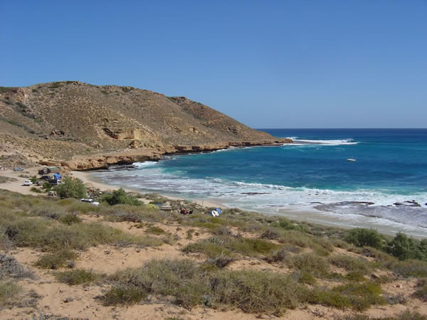 Carnarvon Blowholes to Red BluffYou can see some of the campsites here in the bay at Red Bluff and if you look closely you can see the surfers catching waves off the point and a sailing boat moored in the bay. The beach looks nice but swimming would be dangerous. Previous | Album | Next |