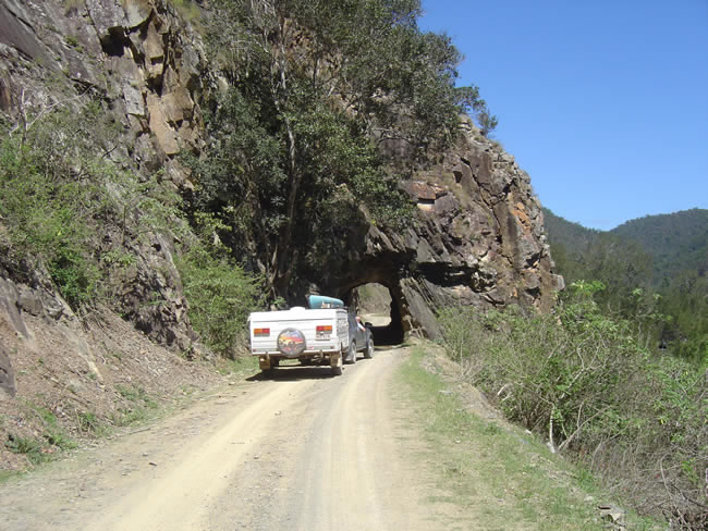 Clarence River Valley, NSWIt is said that this road was carved out by convicts last century with the tunnel being built by a contractor in c1866-68. This narrow dirt road is not recommended for large caravans. It has a clearance of only 3.2m and no space to turn around if you find out your caravan is too high. Previous | Album | Next |