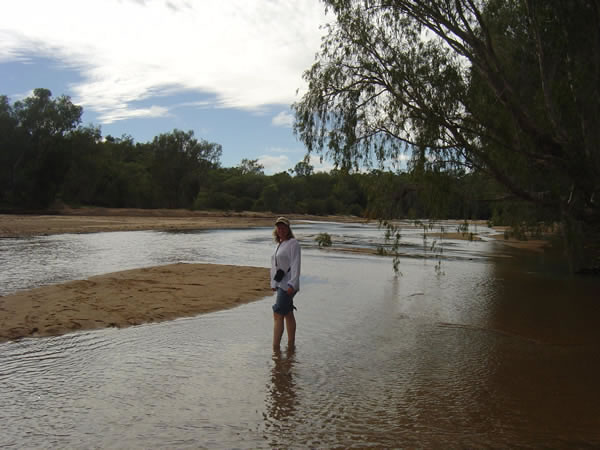 Cobbold Gorge - Robertson RiverThe Newcastle Ranges are on the eastern boundary of the Cobbold station. Pebbled sandstone escarpments lay to the west. Various creeks flow into the Robertson River near here. We found bits of agate and apparently there is still gold to be found around here. We met a camper who had spent a few days at Agate Creek just south of here and he showed us some of the agate pieces he had found. Previous | Album | Next |