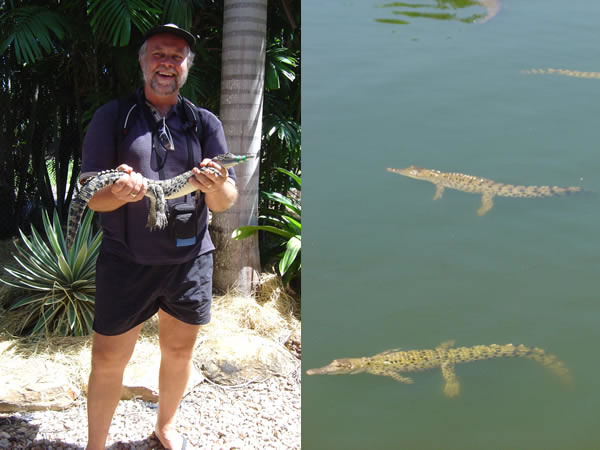 Darwin, Northern TerritoryThese Crocodylus Park crocodiles were less than 2 years old. They had them in all sizes. Judging by the tape around the mouth while we held them I am presuming even these small ones can do some damage. They are bred for research and education but also many are farmed out for leather goods. Previous | Album | Next |
