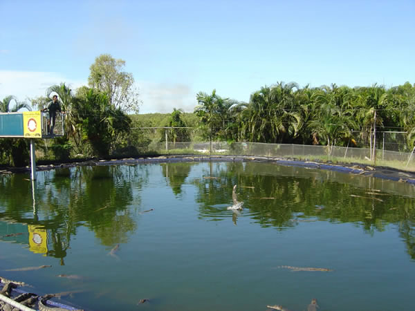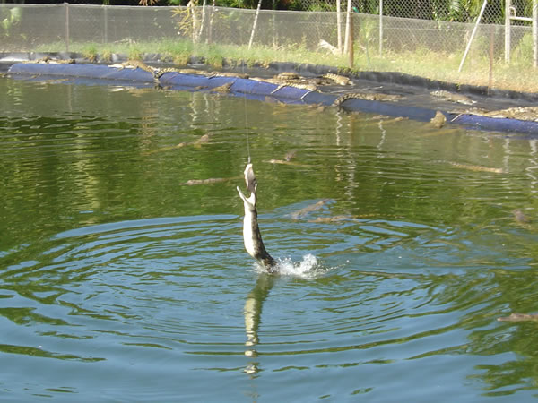 Darwin, Northern TerritoryThe baby crocodiles were offered fish on a wire pulley system. It is amazing to see how easily they can jump out of the water. They leap up an entire body length (SEE photo). Translate that to the older crocs that are more than 3 metres long and it is quite an impressive feat. Previous | Album | Next |